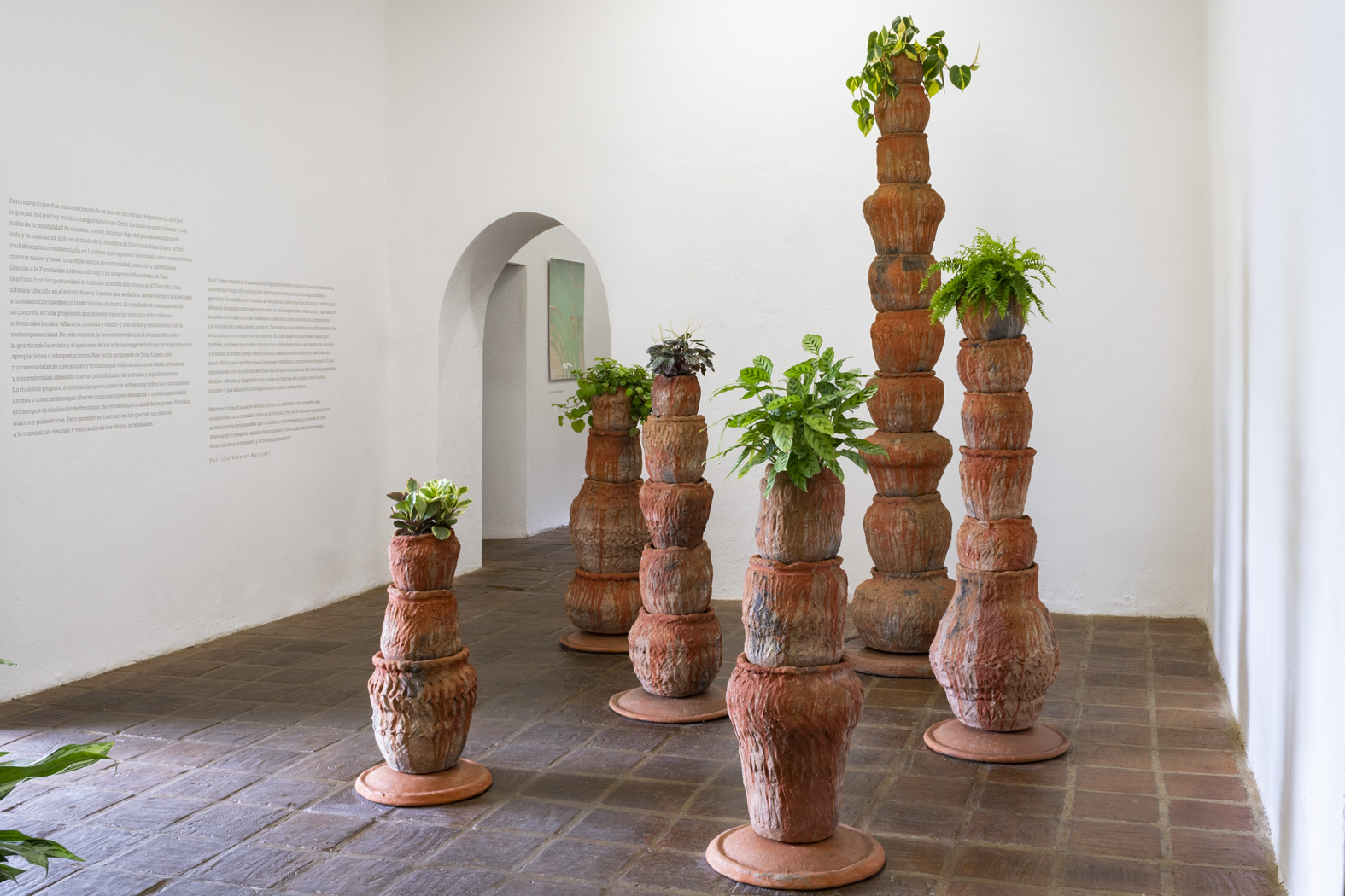 Retornar a lo que fue, sacar del foso la fe es uno de los versos del poema Lo que fue, lo que fui, del poeta y músico margariteño Juan Ortiz. La frase es contundente y nos habla de la posibilidad de rescatar, volver, retomar algo del pasado recuperando la fe y la esperanza. Este es el título de la muestra de Francisca Sosa López, artista multidisciplinar residenciada en Londres que regresa a Venezuela para reencontrarse con sus raíces y tener una experiencia de comunidad, creación y aprendizaje. Gracias a la Fundación ArtesanoGroup y su programa Hacedores de País, la artista tuvo la oportunidad de trabajar durante dos meses en El Cercado, zona alfarera ubicada en el estado Nueva Esparta que se dedica, desde tiempos ancestrales, a la elaboración de objetos tradicionales en barro. El resultado de esa experiencia se concreta en una propuesta que pone en valor los vínculos entre saberes artesanales locales -alfarería, cestería y tejido- y sus nexos y resonancias con la contemporaneidad. De esta manera, la muestra evidencia el intercambio entre la práctica de la artista y el quehacer de los artesanos generándose correspondencias, apropiaciones e interpretaciones. Hay, en la propuesta de Sosa López, una transversalidad de conexiones y miradas que redimensionan el objeto artesanal y sus materiales abriendo nuevas posibilidades de lecturas y significaciones. La muestra propone, entonces, la oportunidad de reflexionar sobre las valoraciones, límites e intercambios que ofrecen nociones como artesanía y contemporaneidad en tiempos de disolución de fronteras, de interdisciplinariedad, de lenguajes híbridos, mixtos y polisémicos. Pero también en tiempos en los que hay un retorno a lo manual, un resurgir y valoración de los oficios artesanales.