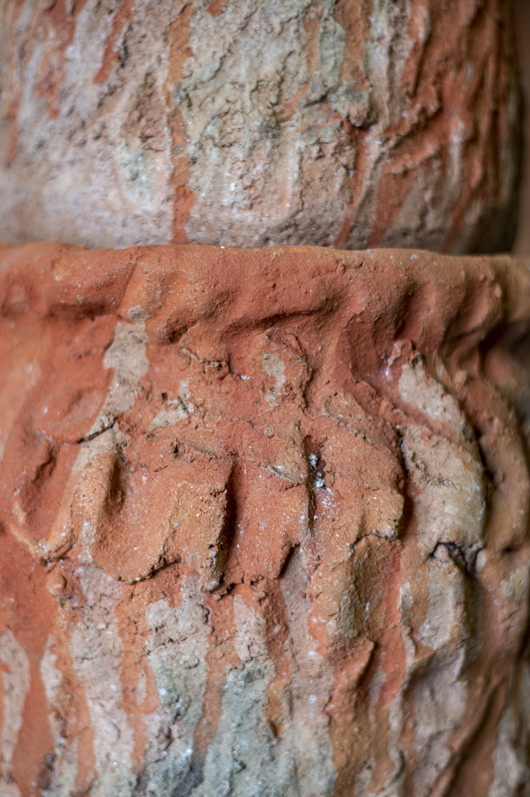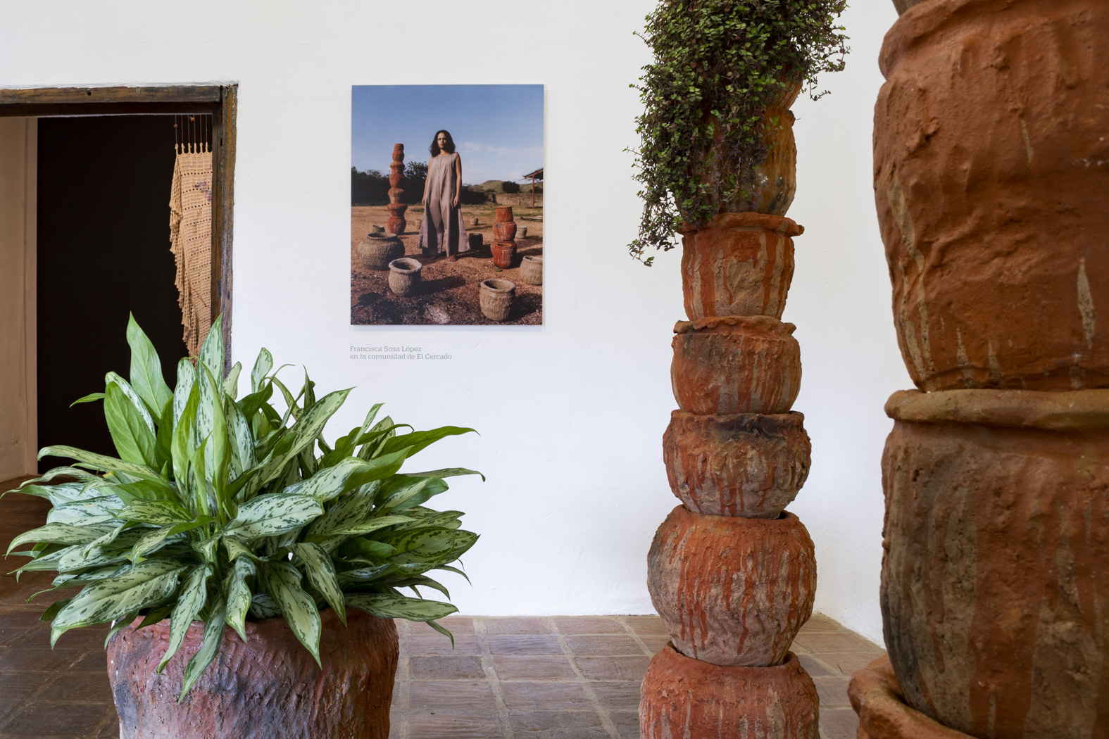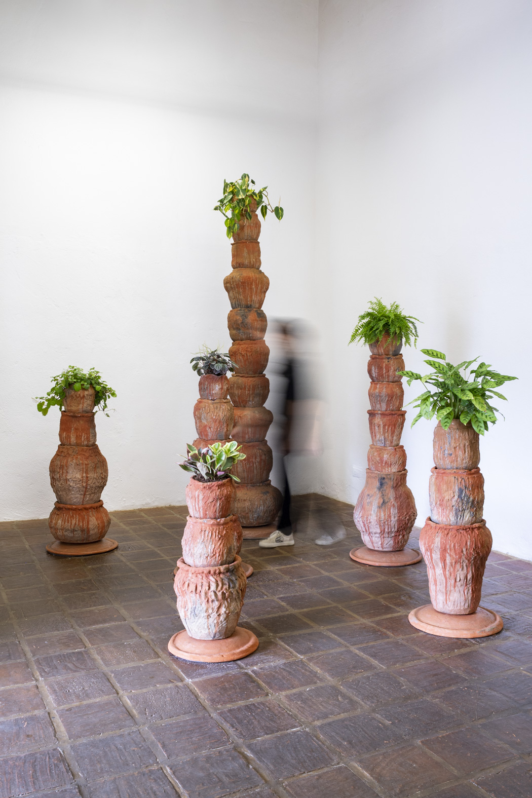 9 columnas elaboradas a partir de 48 vasijas de barro cocidas a quema a cielo abierto, plantas. Medidas variables.