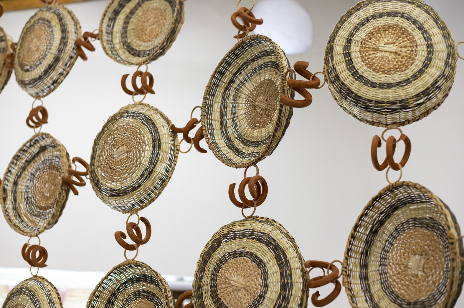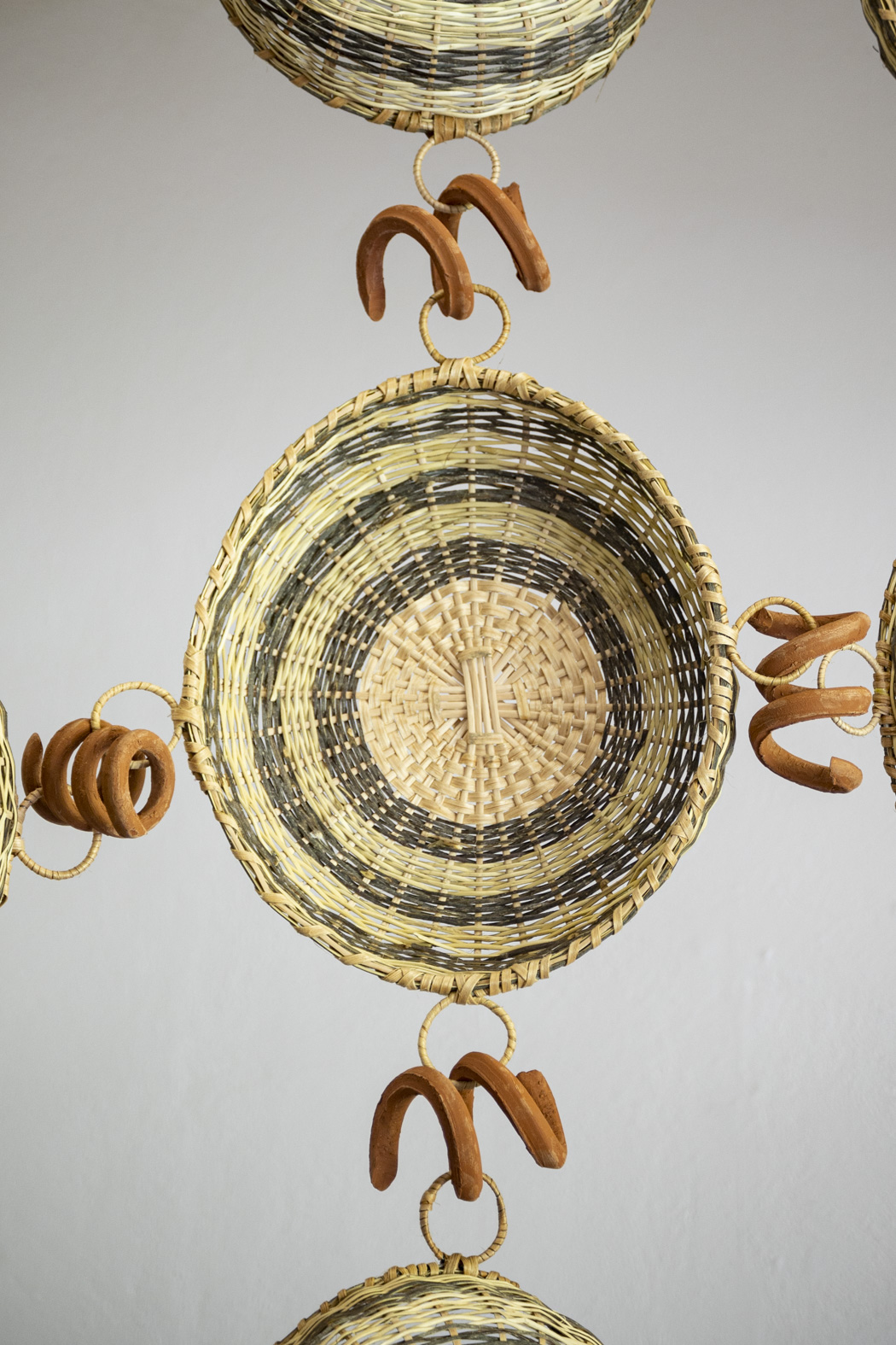 36 maras, 70 aros de cerámica, cadenas de cerámica y cuerdas de palma. 325 x 325 cm aproximadamente